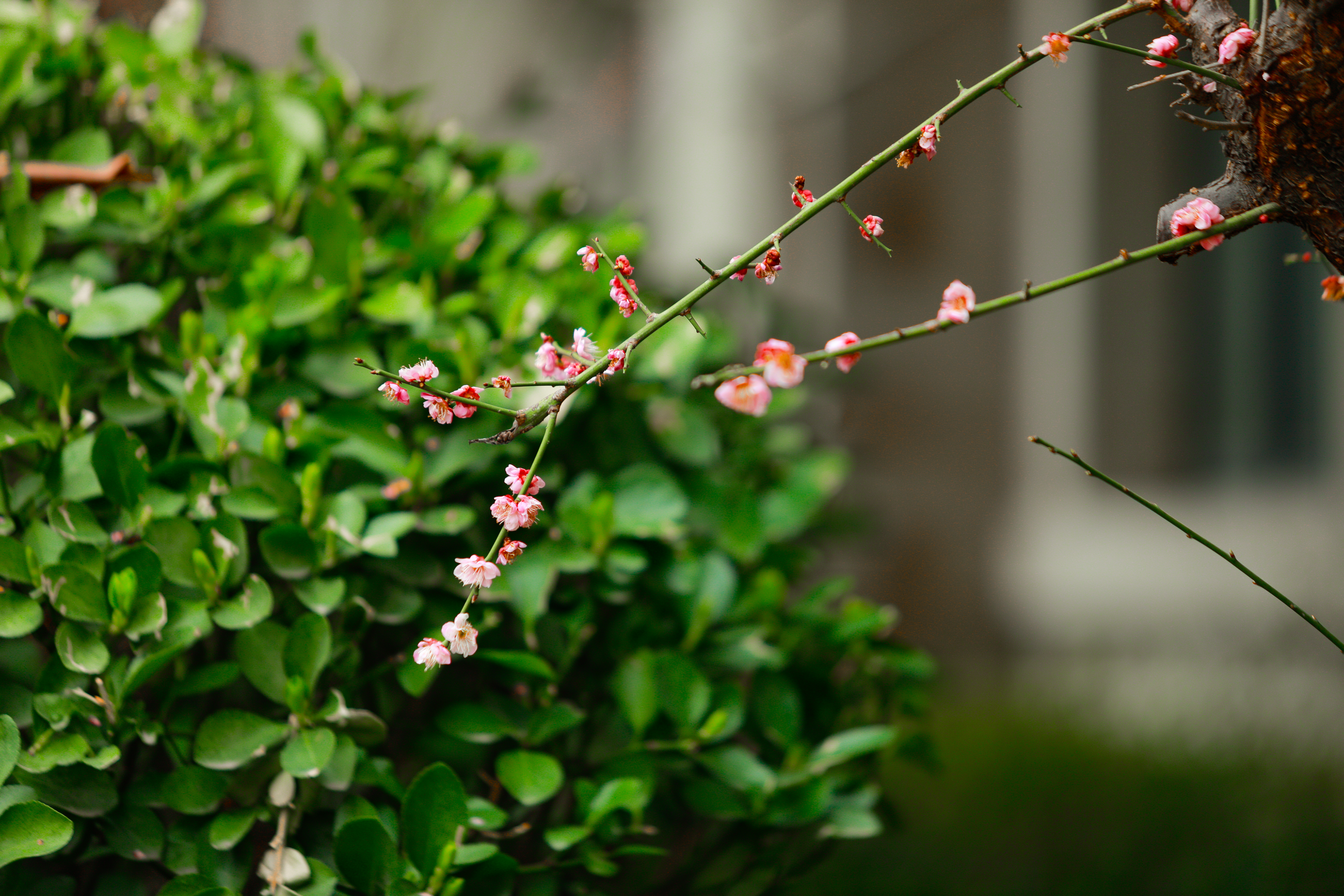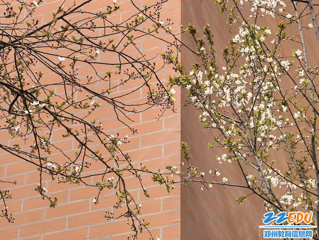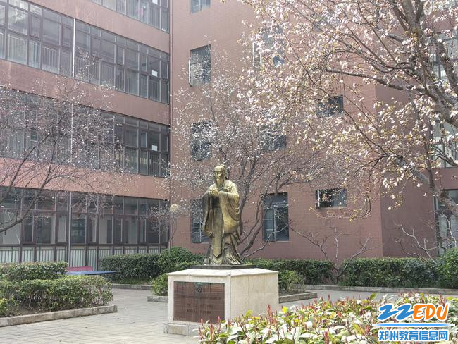 郑州高新区科学大道第二小学里,春的气息悄然弥漫:红叶李映衬着红墙,孔子雕像被花朵围绕,一切都是美好的样子。