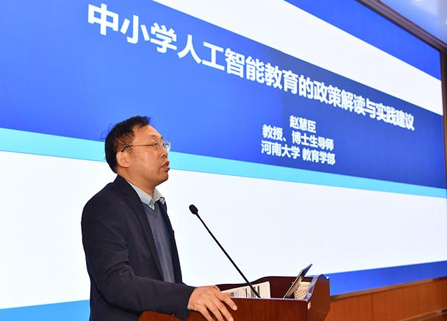 在随后召开的学术交流研讨会上,中国教育学会拔尖创新人才基础培养专业委员会秘书长何静,河南大学教育学院副院长、教授、博士生导师赵慧臣,分别以“创新人才成长规律与培养模式”和“中小学人工智能教育的政策解读与实践建议”为主题做学术报告。