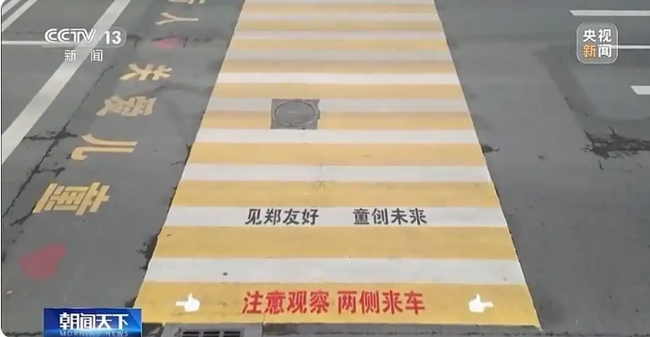 记者分别在中原区、惠济区的小学门口看到,斑马线搭配“见郑友好 童创未来”童趣标语。