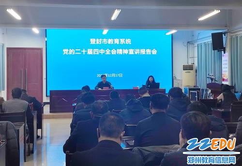 为深入学习贯彻党的二十届四中全会精神,切实把登封市教育系统广大党员干部的思想和行动统一到党中央决策部署上来,推动全会精神转化为建设教育强市的生动实践,12月17日下午,登封市教育系统举行学习贯彻党的二十届四中全会精神宣讲报告会。登封市教育局党组书记、局长马宝仓主持会议。