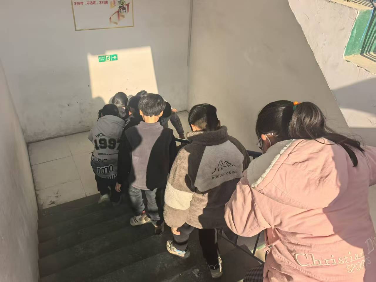 约一分钟后,象征着“主震结束,可能发生因地震引发的次生火灾”的消防警报长鸣响起,消防安全疏散演练随即展开。各班班主任及任课教师迅速到位,组织学生用湿毛巾或衣袖捂住口鼻,弯腰低姿,按照预定的疏散路线快速撤离。整个过程中,学生们紧张而不慌乱,紧凑而不拥挤。按照预案,五年级学生率先开始撤离,紧邻的六年级学生随后跟上,楼层间衔接流畅,有效避免了人员拥堵情况。
