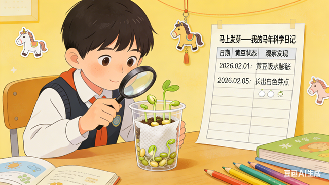 惠济区实验小学则设置了“马上发芽——我的马年科学日记”科学观察任务,让学生完成黄豆发芽实验观察记录表,认真记录黄豆发芽的全过程,做好每日观察、及时记录现象与发现,感受生命成长的乐趣,让科学探索伴随学生度过有趣的寒假。