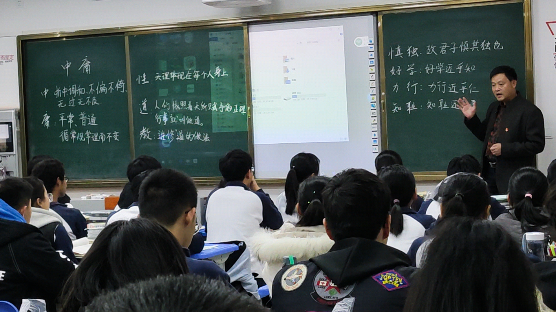 本节课为《中庸》的最后一节,谷红军老师从检查评价学生对“性”“道”“教”“慎独”“好学”“力行”“知耻”等字词的理解入手,了解学生对已学知识的掌握,继而导入新课。在谷红军老师的引导下,学生在学案的基础上,通过回答、补充和老师的评价,完成了重点字、词、句、篇的翻译,充分调动了学生的积极性,夯实了学生对基础知识的掌握。谷红军老师在此基础上回顾全文,精讲中庸之道的内涵及在中华传统文化中的地位,通过“华为”事件加深了学生对中庸之道的理解,感受中华文化的精髓。学以致用环节,背默小组代表上台背默,集体评价,背默错误较多的同学表演唱歌,让课堂气氛更加融洽,让枯燥的文言文教学更加生动、鲜活。最后,学生的小作文写作充分检验了学生对“中庸”的理解和认识,学生的素养也有了较大提升。