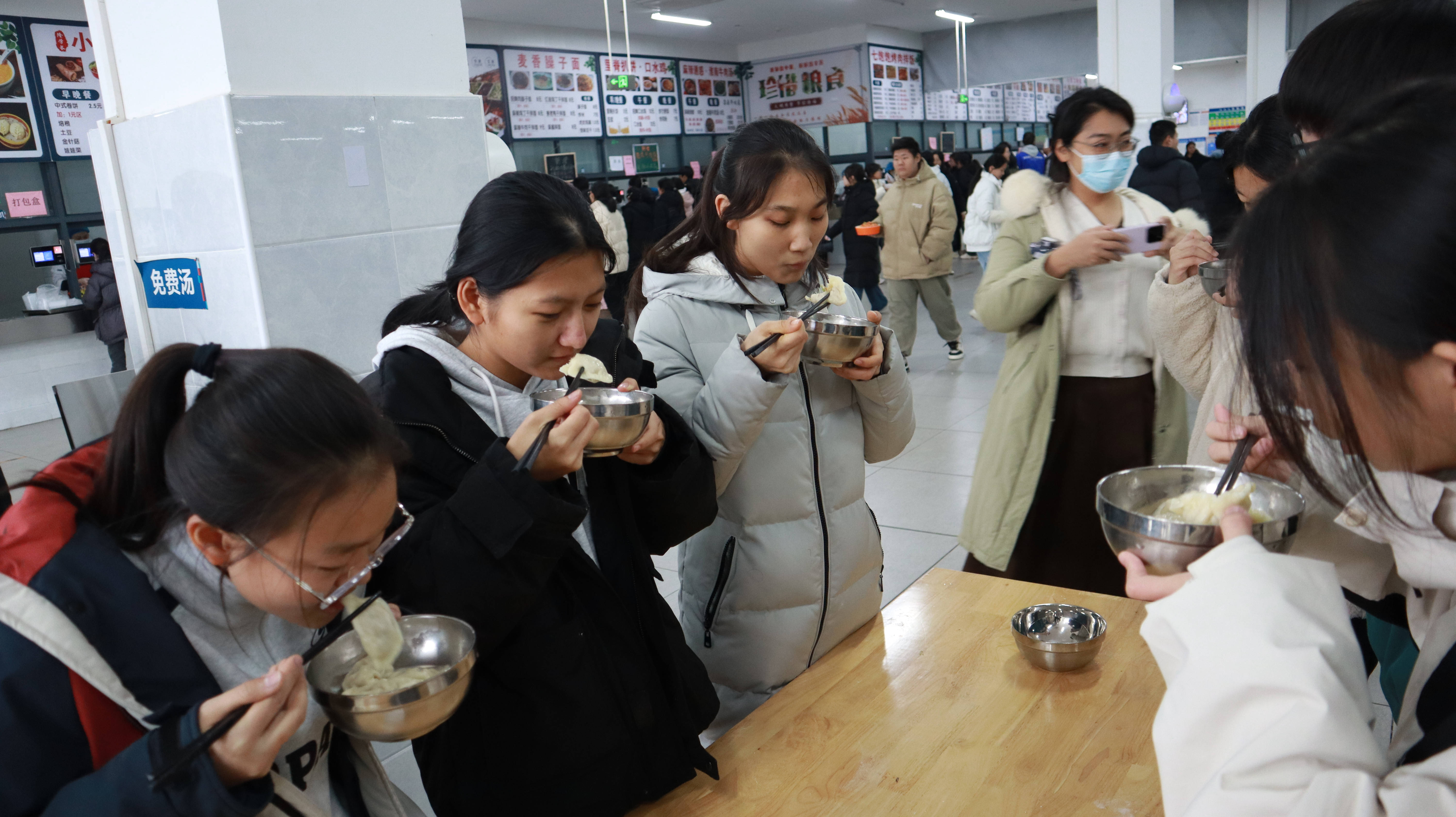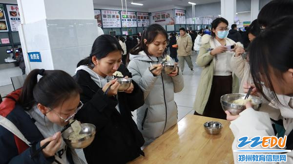 学生们吃着热气腾腾的饺子
