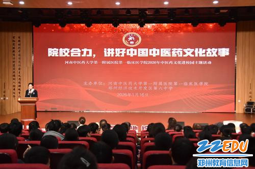 2026年1月16日下午,郑州经开区第六中学与河南中医药大学第一附属医院第一临床医学院联合举办的“院校合力,讲好中国中医药文化故事——河南中医药大学第一附属医院第一临床医学院2026年中医药文化进校园主题活动”在郑州经开区第六中学报告厅举行。