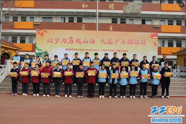 为表彰先进、树立榜样,郑州经济技术开发区九龙中学校长张书亮宣读上学期优秀学生表彰文件。学校对学习之星、文明之星、优秀社团学生及先进班集体等予以表彰,学校领导为获奖代表颁奖,鼓励全体同学以榜样为帆,奋力追逐梦想。