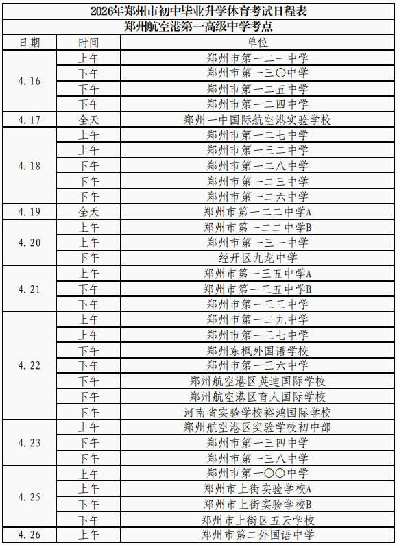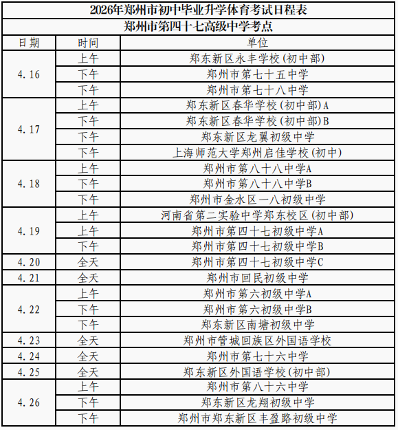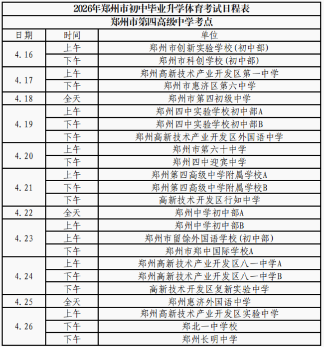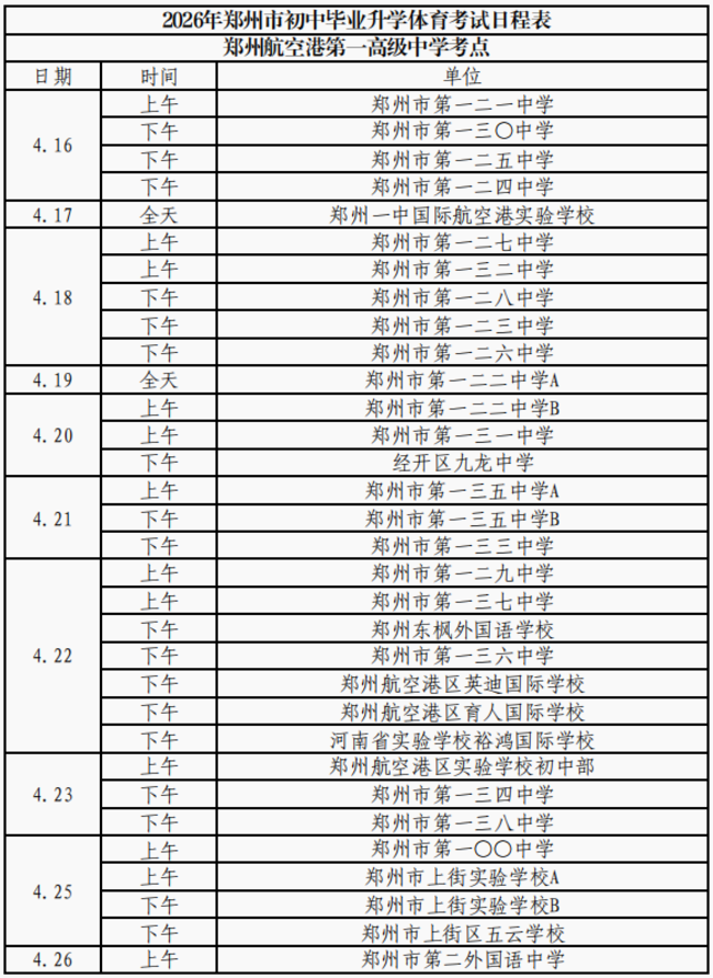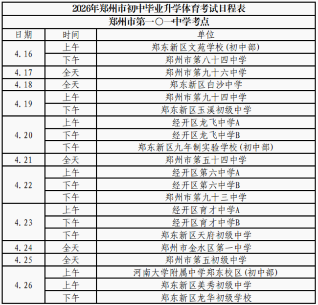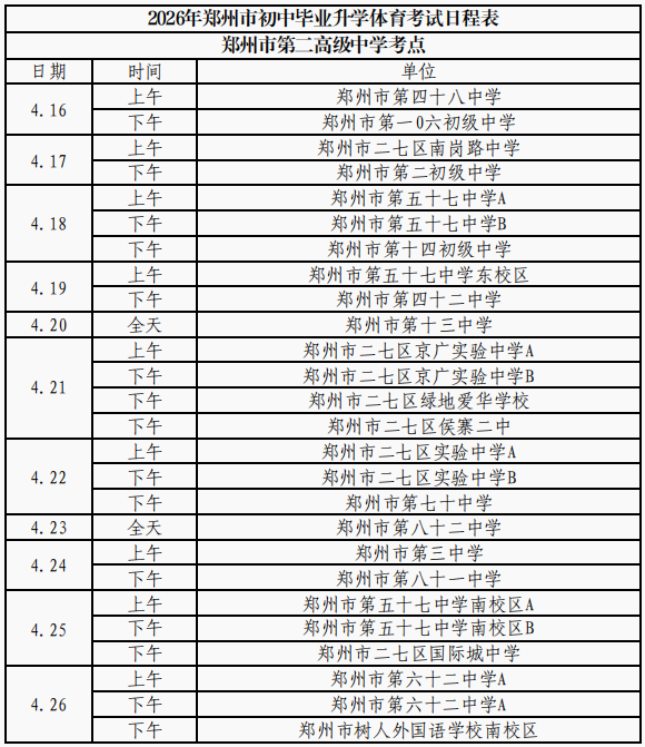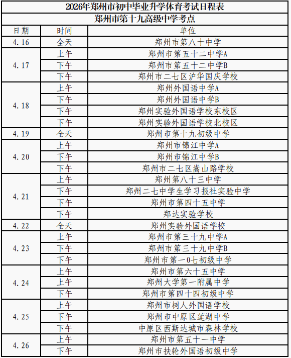 (本网讯)2026年郑州市区初中毕业升学体育考试日程和考点安排表出炉!