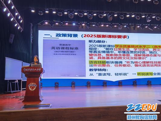 听说课展示结束后,郑州市第五十三中学李静老师带来专题经验分享。她以“聚焦听说整合教学,夯实关键能力培养”为主题,结合自身教学实践,分享了听说整合教学的实施策略、教学心得与实践经验。李静老师的分享干货满满,紧扣高中英语关键能力培养核心,为在场教师开展听说教学、落实素养培育提供了切实可行的思路与方法。