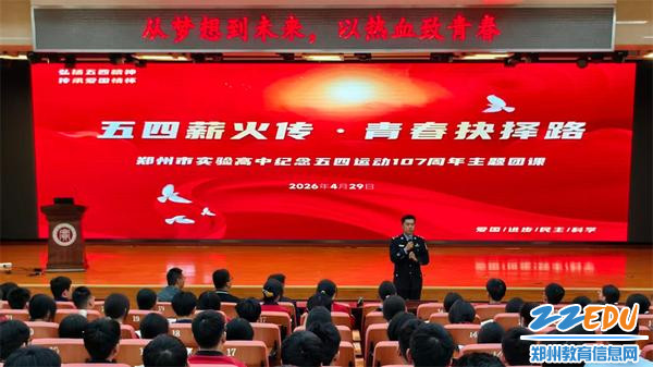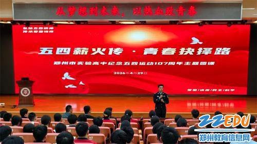 4月29日下午,郑州市实验高级中学举办“五四薪火传·青春抉择路”主题团课,特邀郑州市公安局特巡警支队青年民警走进校园,为学校入团积极分子开展理想教育报告。本次活动是学校入团积极分子培训的重要组成部分,郑州市公安局特巡警支队二大队中队长杨爽,青年民警张方冲、刘齐出席活动;郑州市实验高级中学德育处副主任兼团委书记冯凯、高二年级长张志超参加活动。