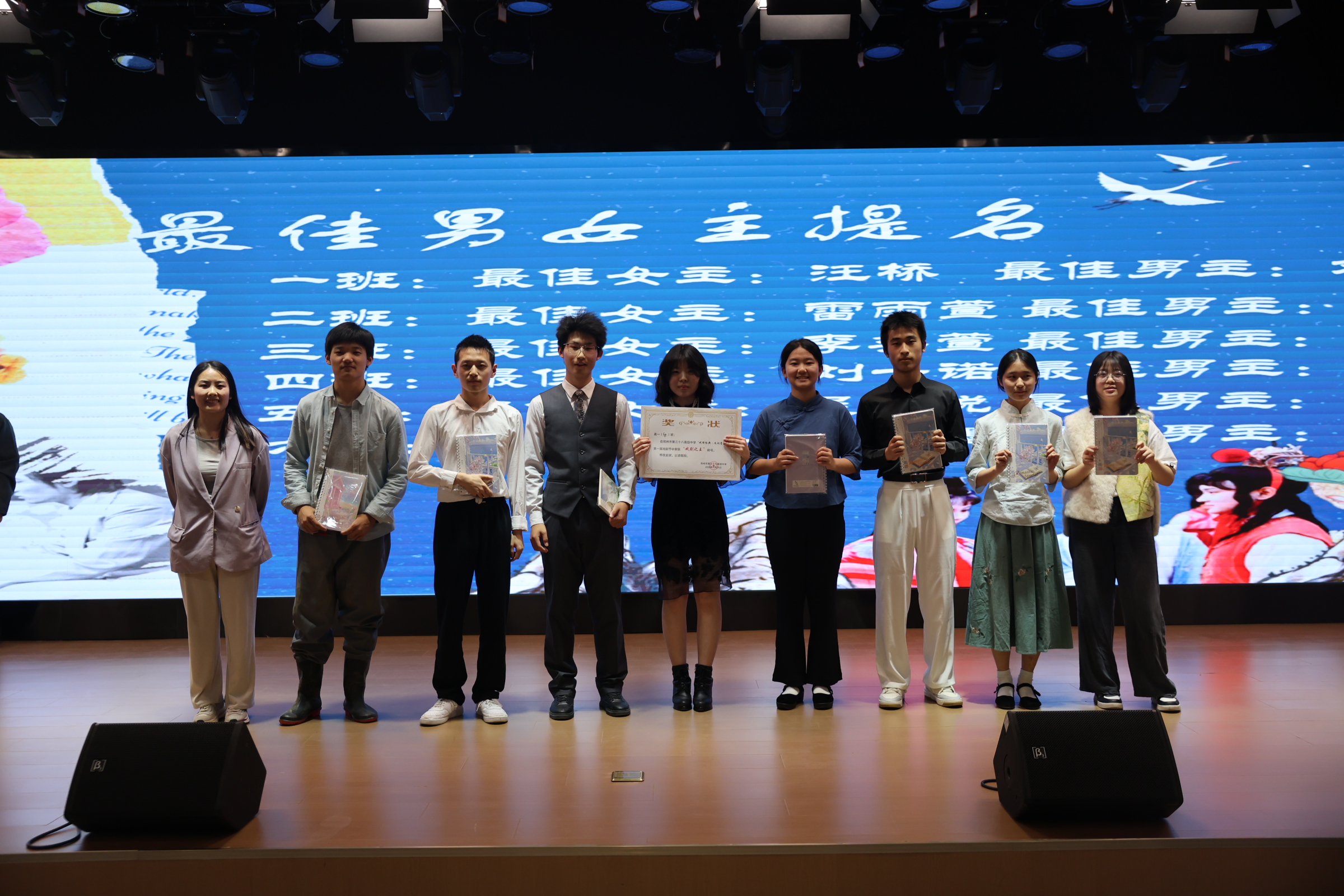 展演结束后,评委组本着公平、公正、公开的原则,从舞台表现、剧本改编、团队配合、创意呈现等多维度综合考评,现场严谨打分、统一核算,集中评选出各类集体奖项与个人单项荣誉。其中,高一(4)班斩获“戏剧之王”重磅荣誉,各班级分别斩获最佳舞台创意奖、最佳剧本改编奖、最佳演绎奖、最具团队凝聚力奖、最佳青春风采奖等多项荣誉;吴晗悦、郭墨衡两位同学凭借扎实功底、真情演绎,分别获评最佳女主角、最佳男主角。学校现场为获奖集体和个人颁发荣誉表彰,激励学子深耕美育、热爱舞台、传承经典。