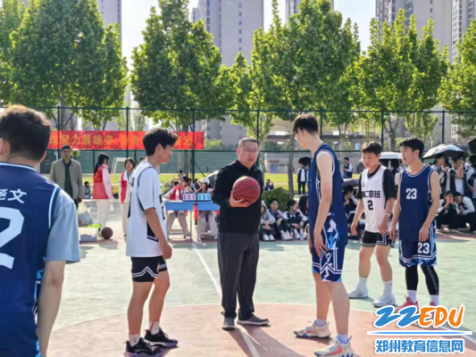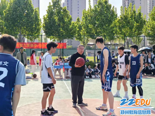郑州市第二十八高级中学党支部书记、校长蔡明生在篮球比赛现场开球