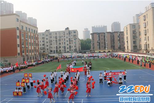 开幕式上,学校国旗队迈着铿锵有力的步伐,庄严地护卫国旗入场。旗手们一个个气宇轩昂,精神抖擞,进行了庄严的升旗仪式,全场师生向国旗致敬,表达了对祖国的热爱和尊敬;花束队挥动鲜花表达心声,朵朵鲜花献给奋勇拼搏的运动健儿。